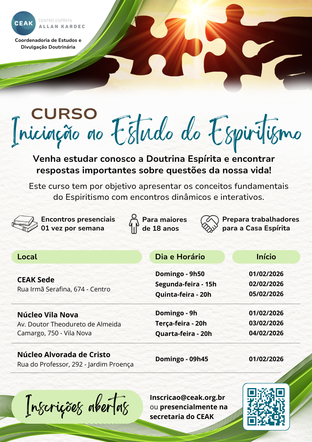 O Início será a partir de 01 de Fevereiro de 2026 em diversos horários na Sede e Núcleos Doutrinários.