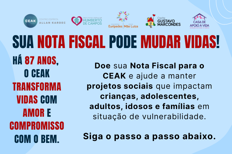 créditos ou sorteios de prêmios. Ao escolher o CEAK como entidade beneficiada, você fortalece a continuidade e a expansão dos nossos serviços.